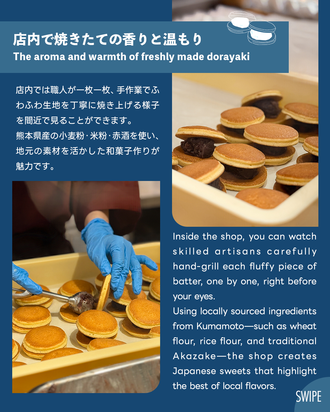 They serve freshly made dorayaki with fluffy pancakes made from locally sourced wheat flour, rice flour, and Akazake from Kumamoto, generously filled with chunky red bean paste from Tokachi, Hokkaido ☺️