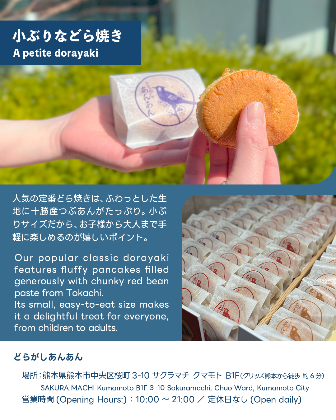 熊本県産の小麦粉や米粉、赤酒を使ったふわふわの生地に、北海道十勝産のつぶあんをたっぷりと挟んだ、できたてのどら焼きを提供しています☺️