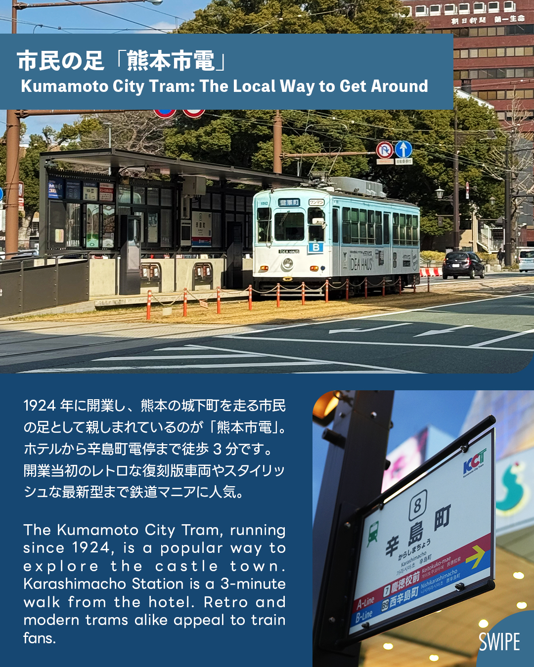 The tram offers easy access to city sights and Aso Kumamoto Airport, with a variety of retro and modern vehicles to enjoy.