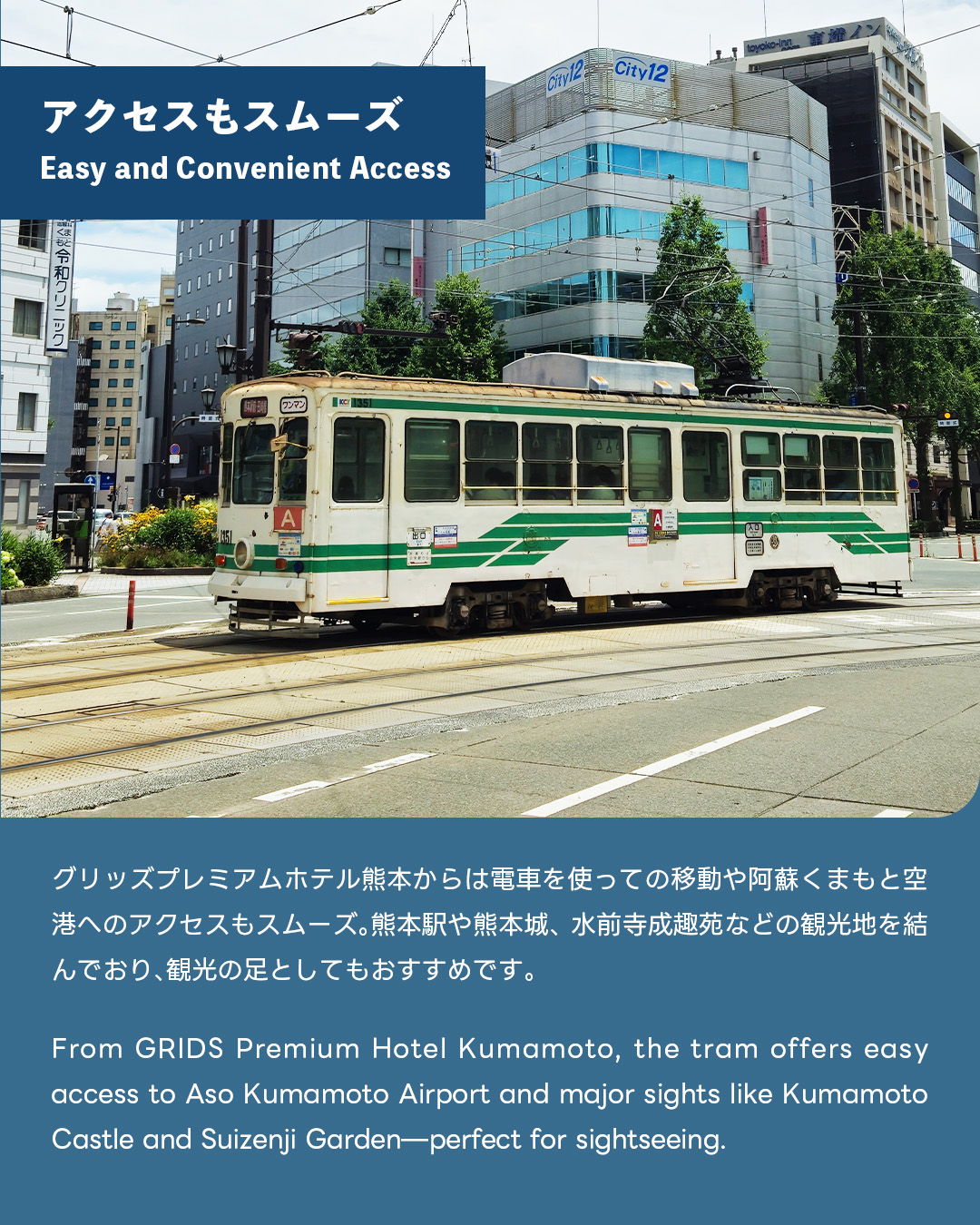 市電を使って市内観光や阿蘇くまもと空港へのアクセスも便利です。