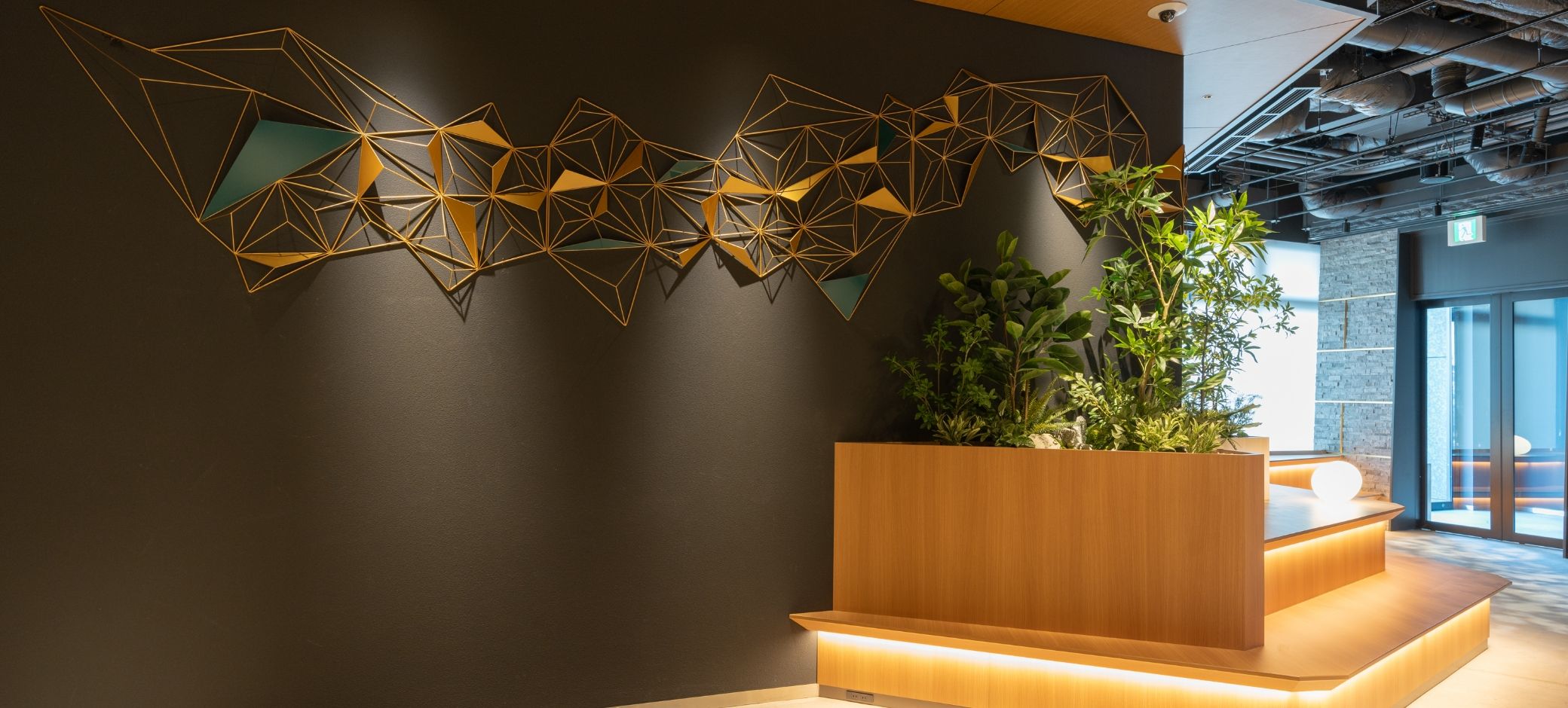 渓谷をイメージしたベンチの背面は熊本城の城壁を模した壁。天井からこぼれる木漏れ日のような照明と相まって、熊本の自然と歴史を感じさせるロビーです。