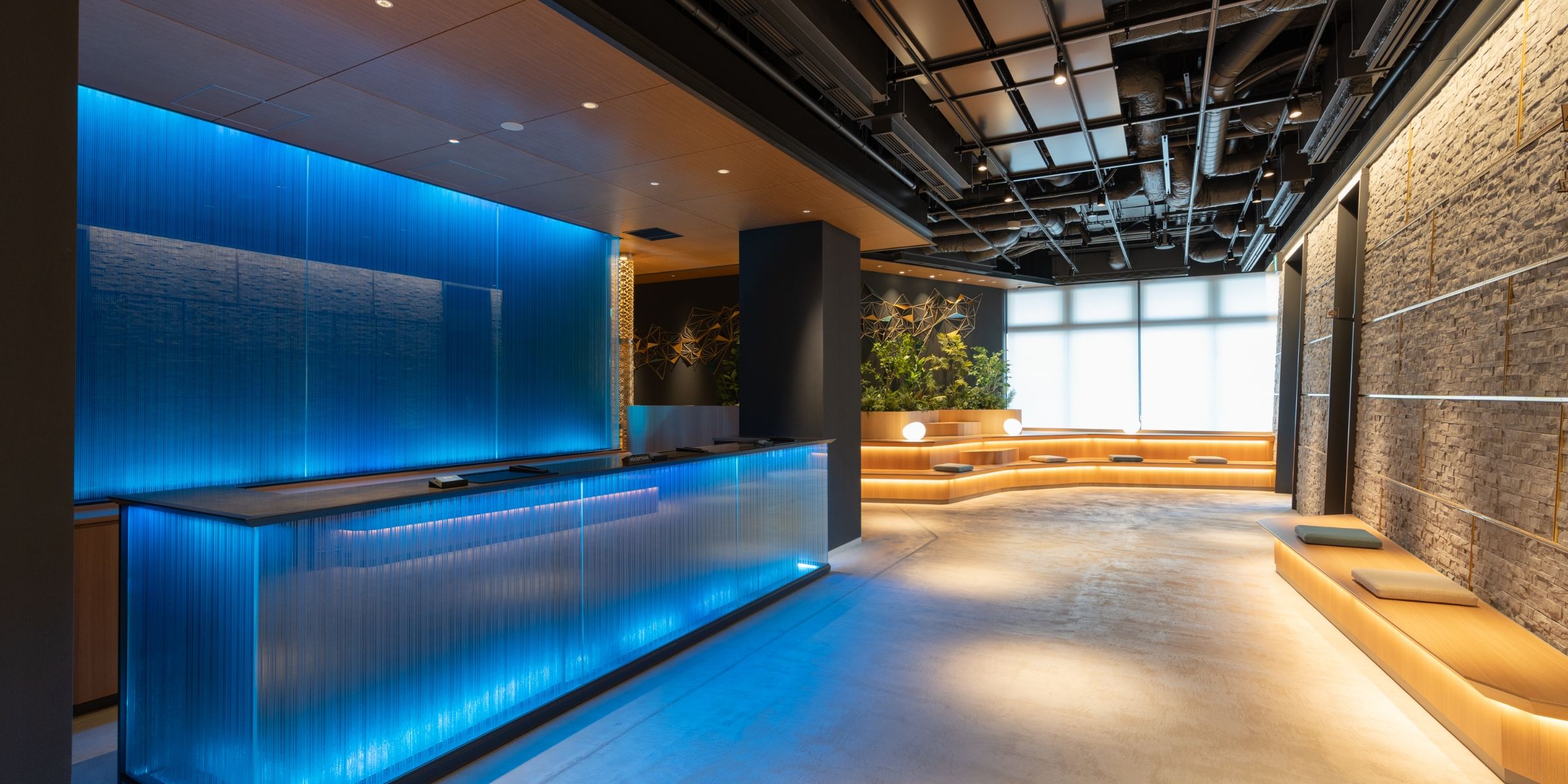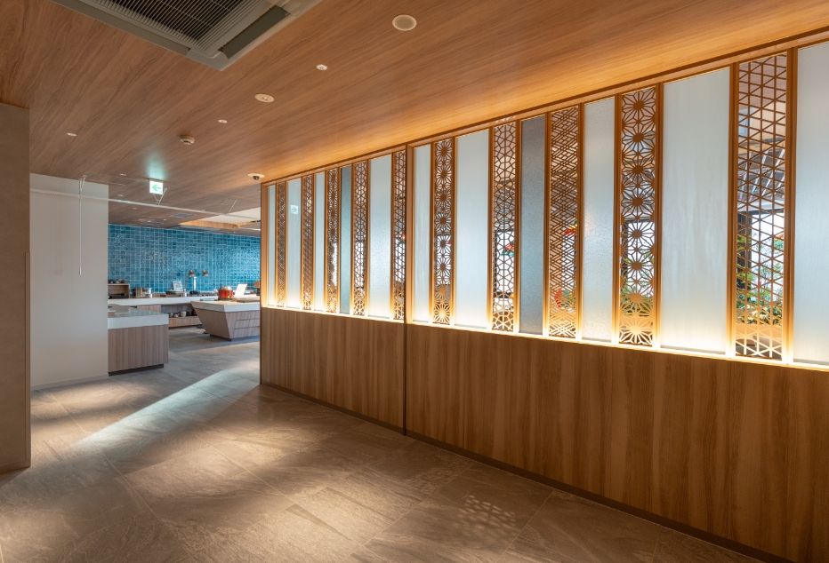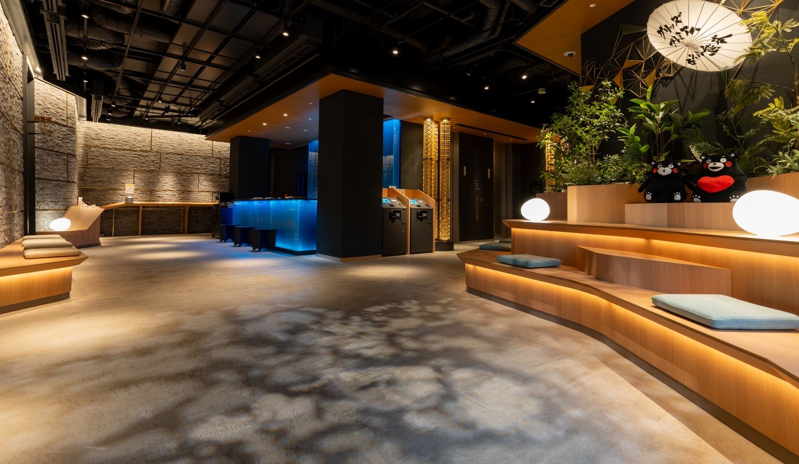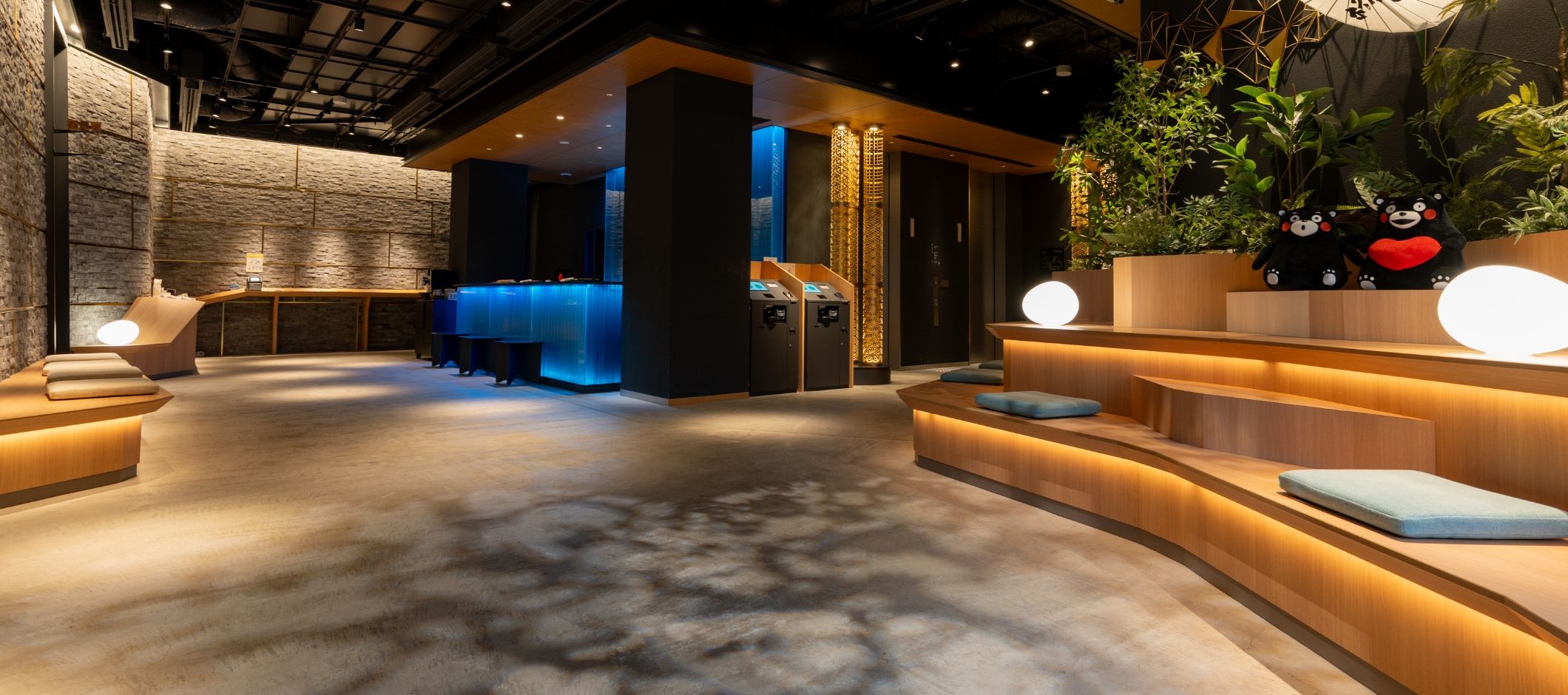 阿蘇小国の鍋ケ滝(https://ogunitown.info/nabegataki/)をイメージしたフロントカウンター、渓谷を模したベンチ、熊本城壁をイメージした壁、木漏れ日照明など熊本の自然と歴史を感じられるロビーです。