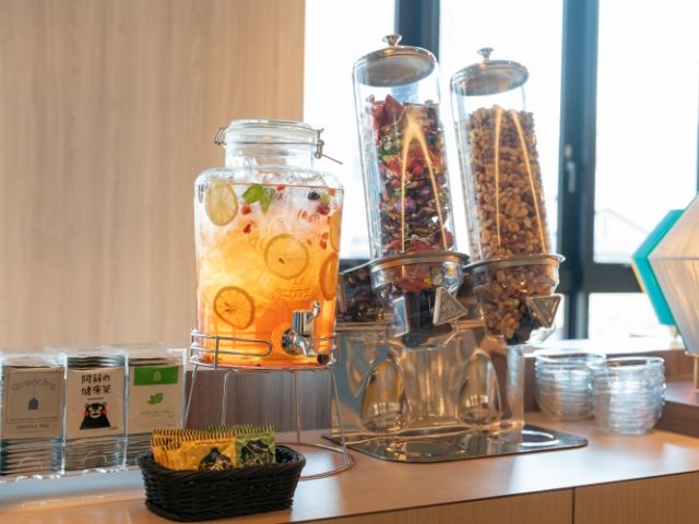 コーヒーやデトックスウォーターといったドリンク、ポップコーンやスイーツなどのスナックをご用意しております。
