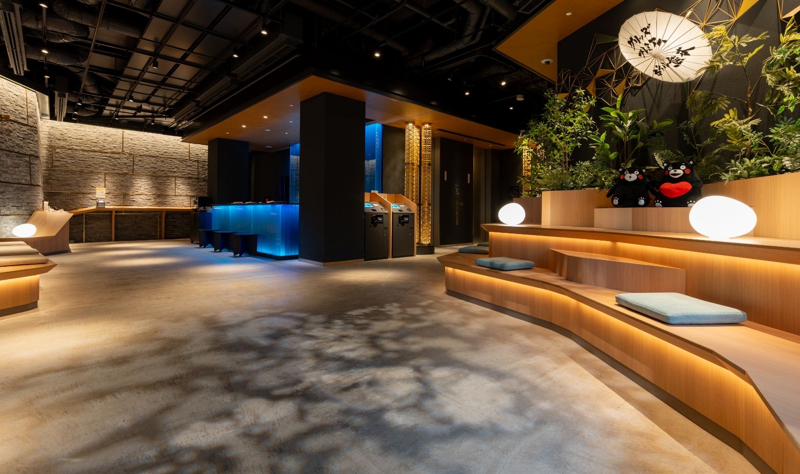 ロビーは水の国・熊本をイメージしたフロントカウンター、熊本の伝統工芸品の竹細工や象眼を用いたモチーフが目を引きます。
